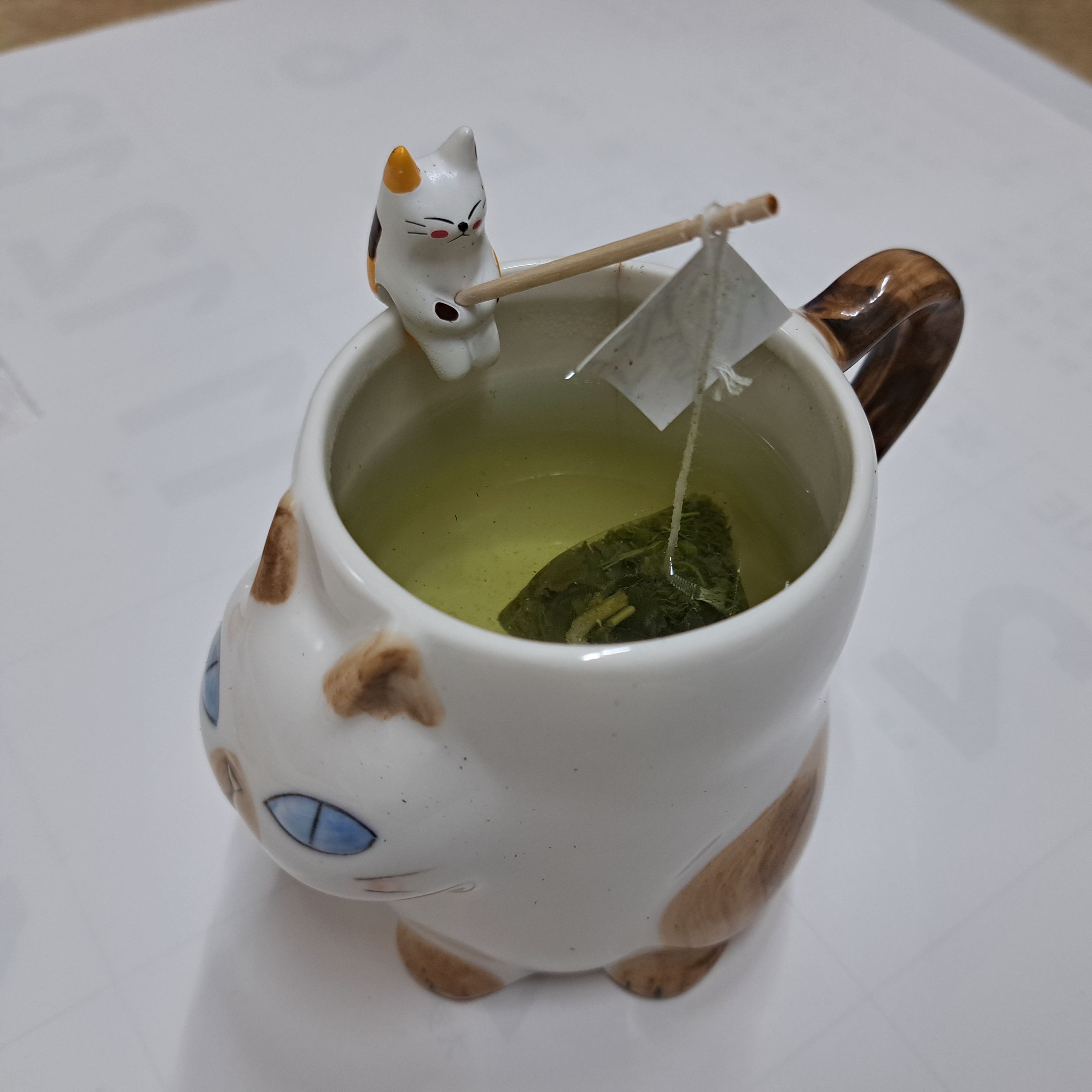 いただいたお茶の中にティーパックを吊るす猫ちゃんが入ってました。猫ちゃんに爪楊枝を持たせて、そこにパックを吊るすと…釣りしてるみたいになって可愛い!!