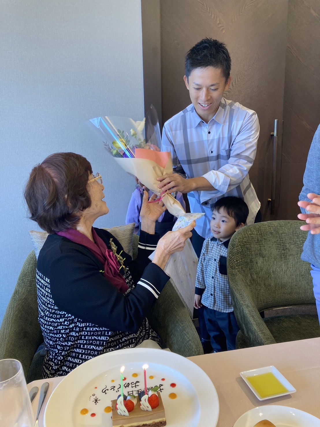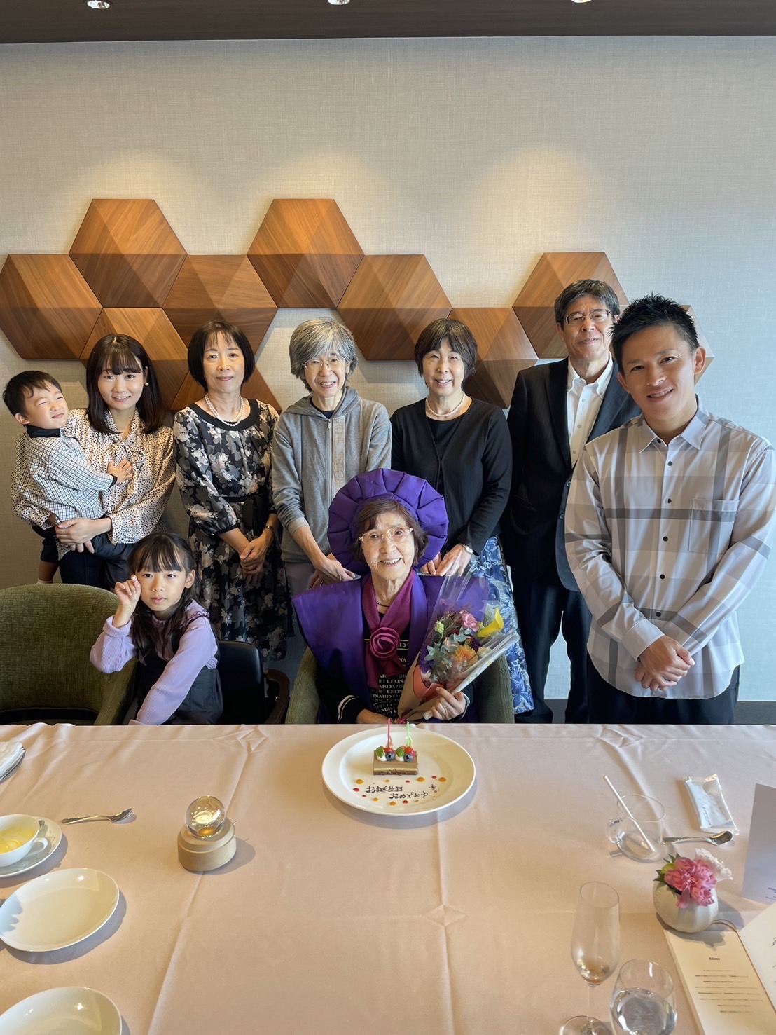 鹿児島で一人暮らしをしている母の卒寿祝いを子供3人孫代表ひ孫代表でお祝いしました。紫の帽子とちゃんちゃんこをホテルが用意してくれていましたが、こんなのを着ると早死にすると信じている母はかたくなに固辞していましたが、なかなか似合うと思います。まだまだ長生きしてね!